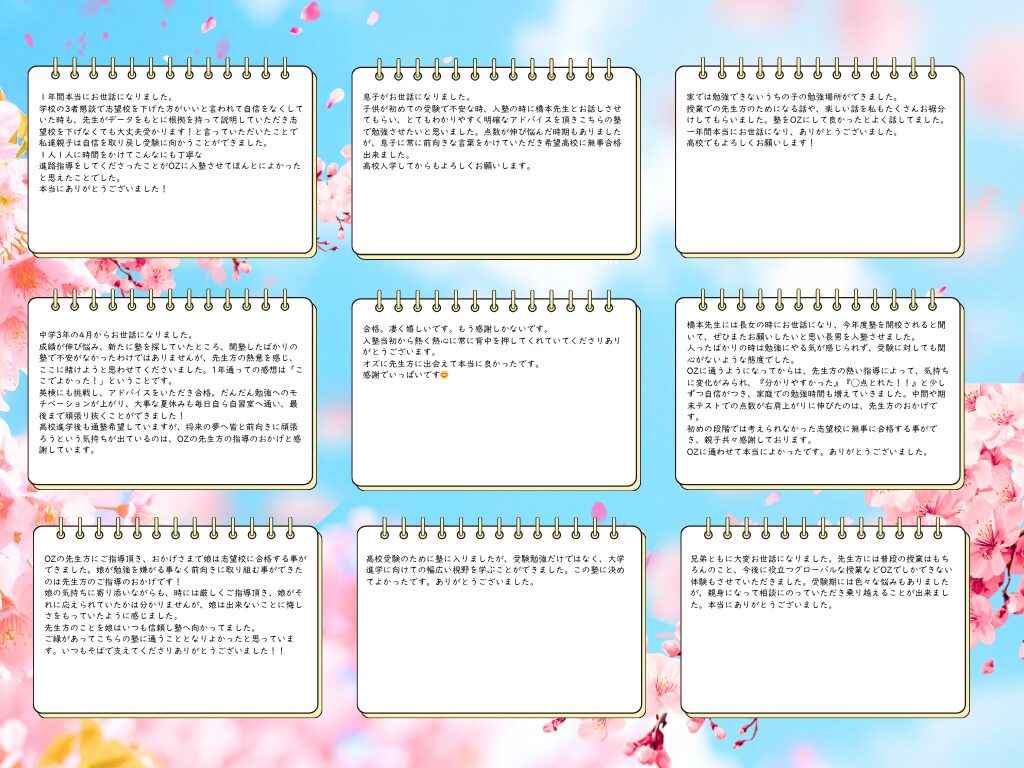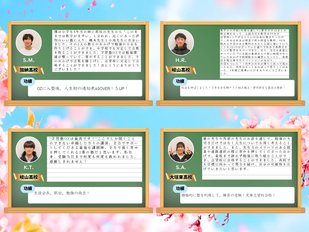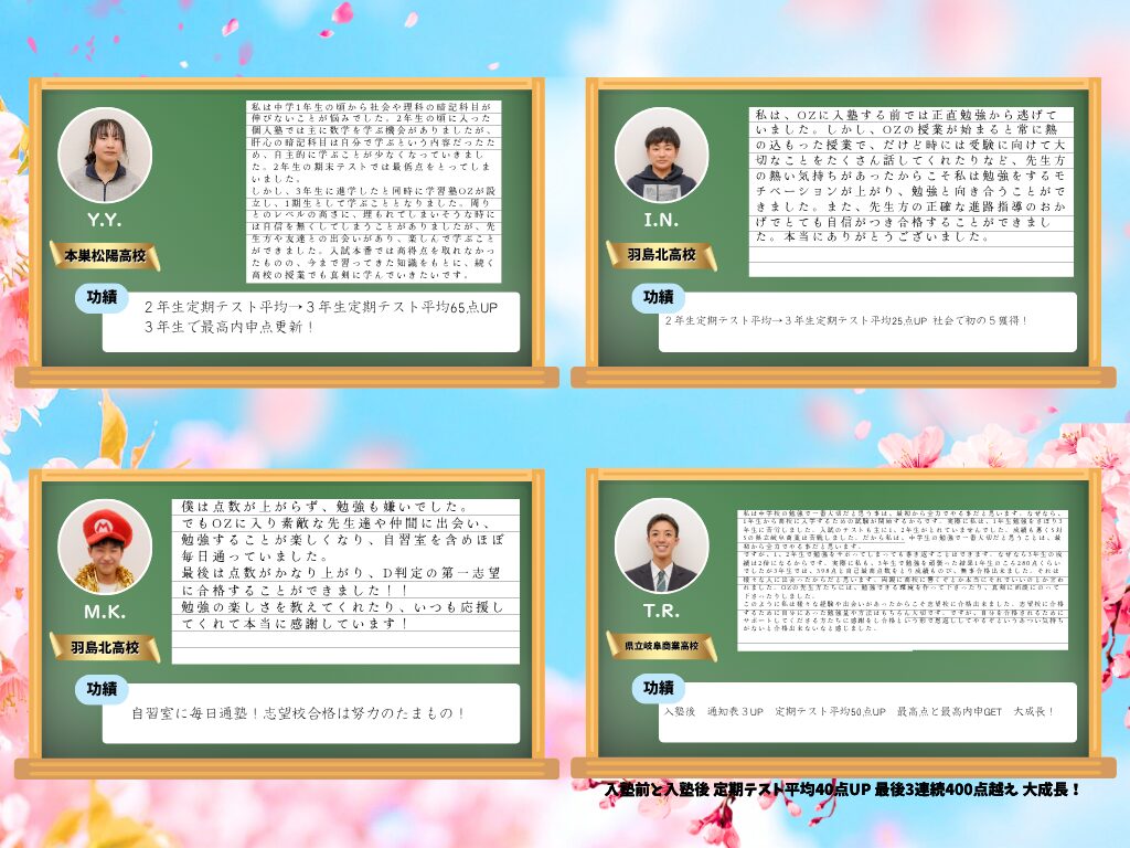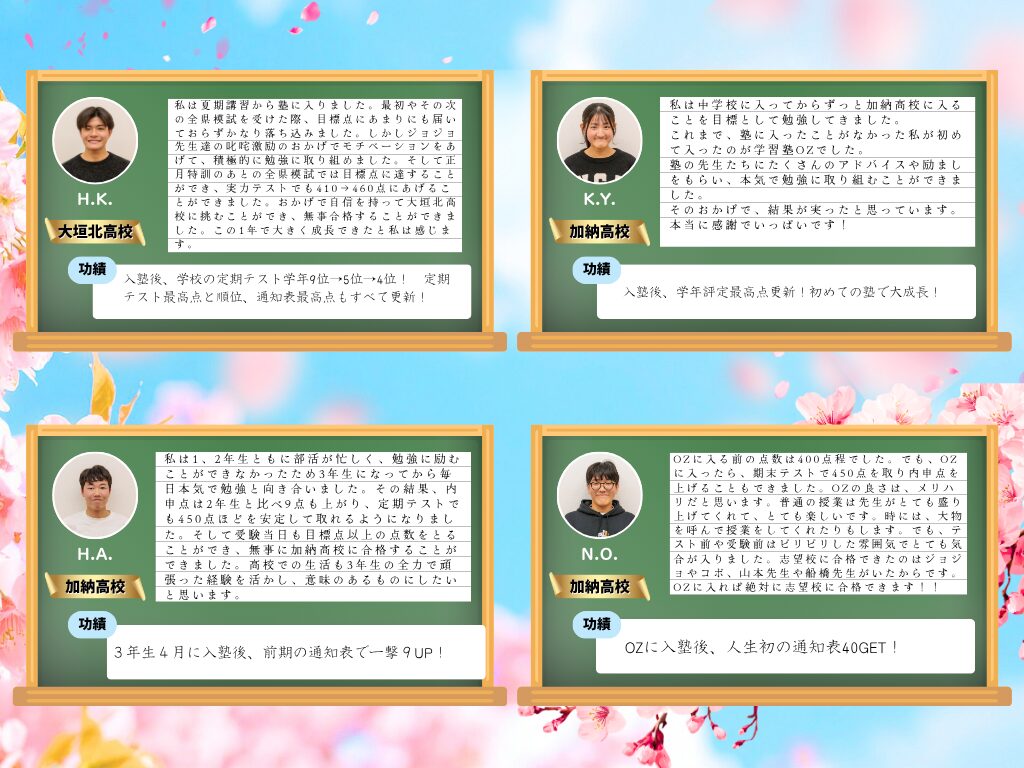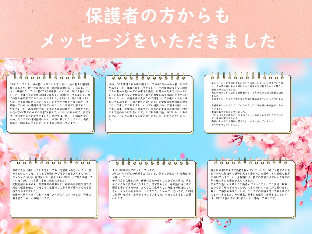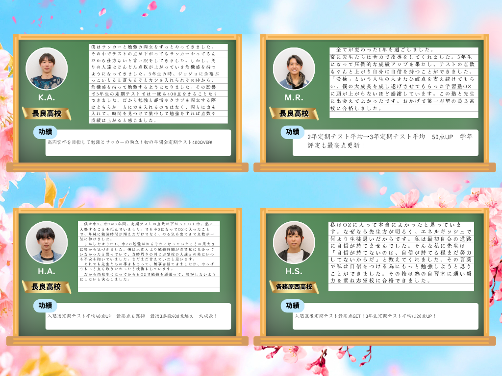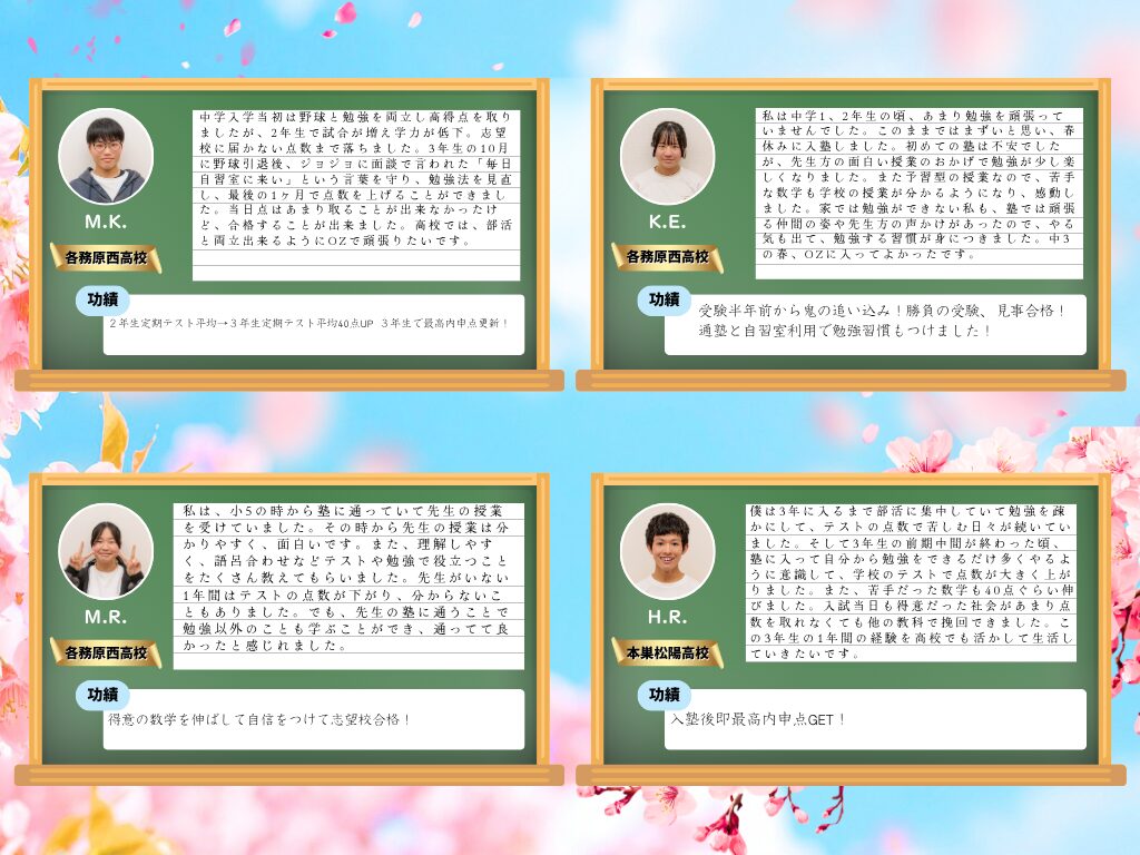 この日をずっと待っていました!先生方のおかげで中学も高校でも鬼勉をモットーに頑張れています。最強の講師陣が迎えるOZに入れば成績上がること間違いなし!