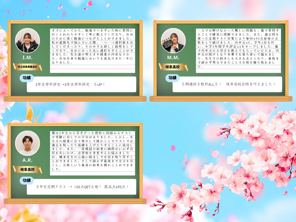 先生たちのおかげで塾に行くのが毎日の楽しみの1つでした!そのおかげで岐阜北高校にも合格できて、先生たちには感謝いっぱいです。瑞穂市で1番パワフルな塾間違いなしです!