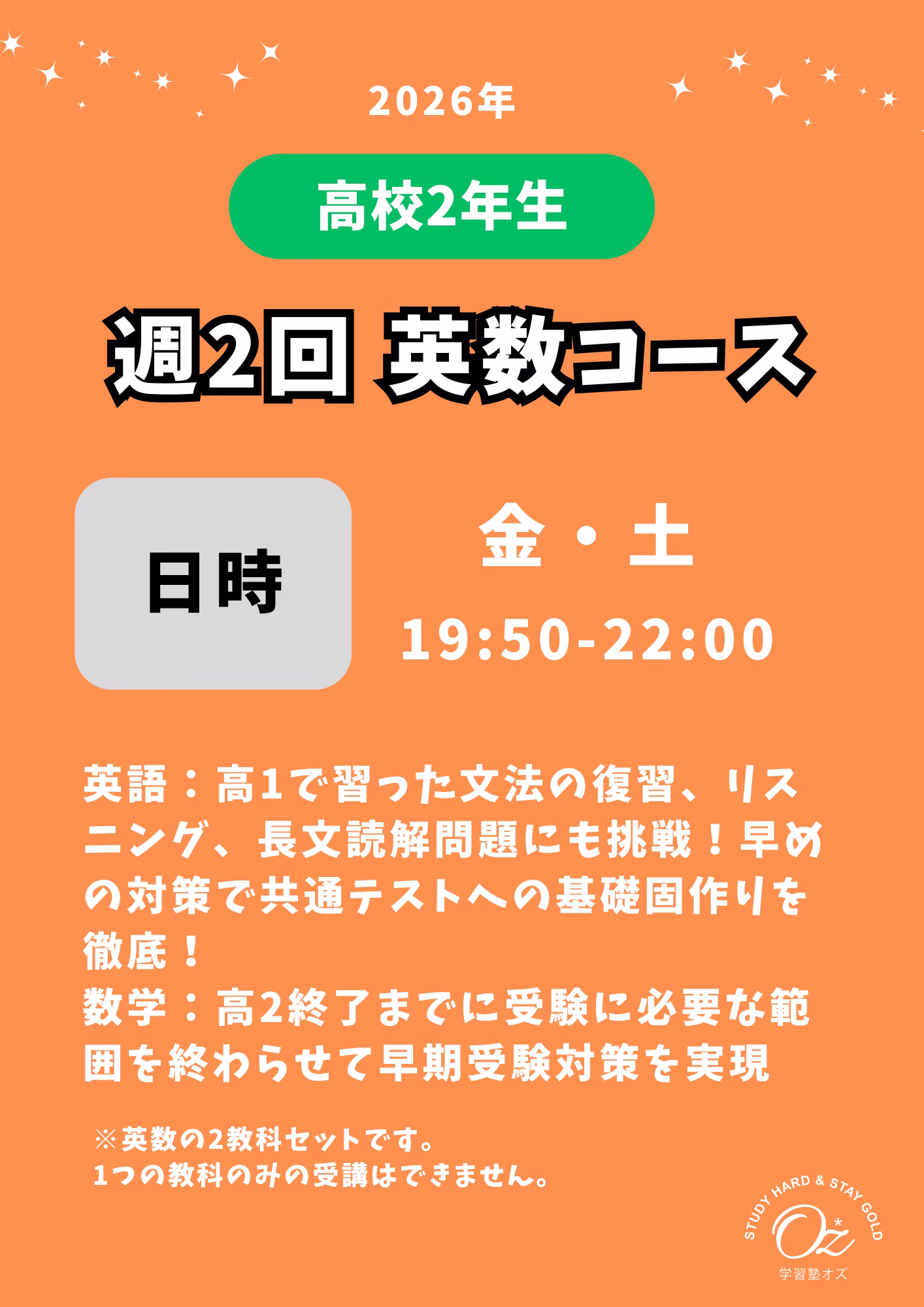 ※このコースでは、英語・数学以外の教科につきましても授業を行いますが、一部科目につきましては、指導可能な曜日に制限がかかる場合がございます。
