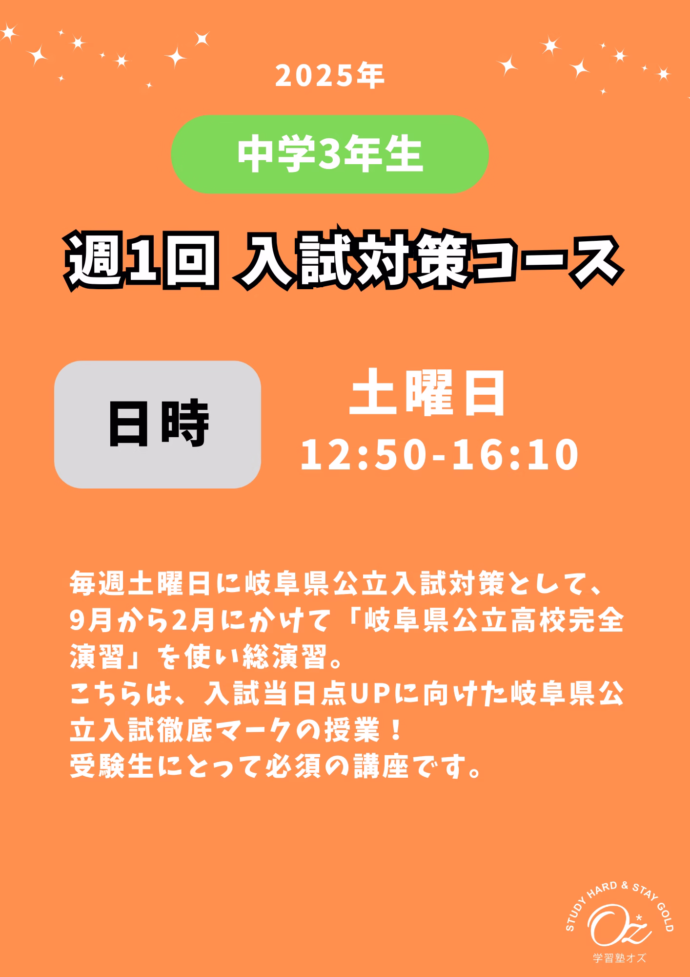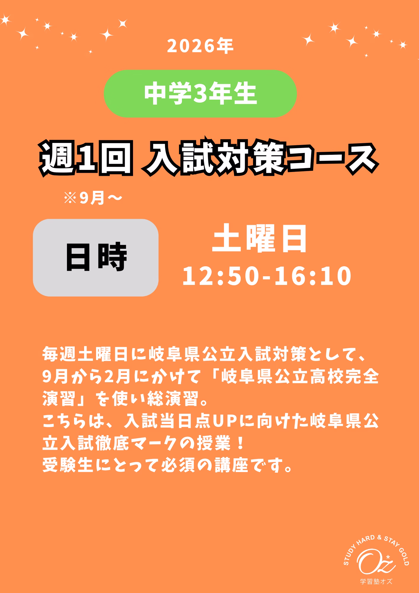 全国の入試問題や岐阜県の入試問題に触れていき、冬期講習で受験全範囲の総復習をもう一度。