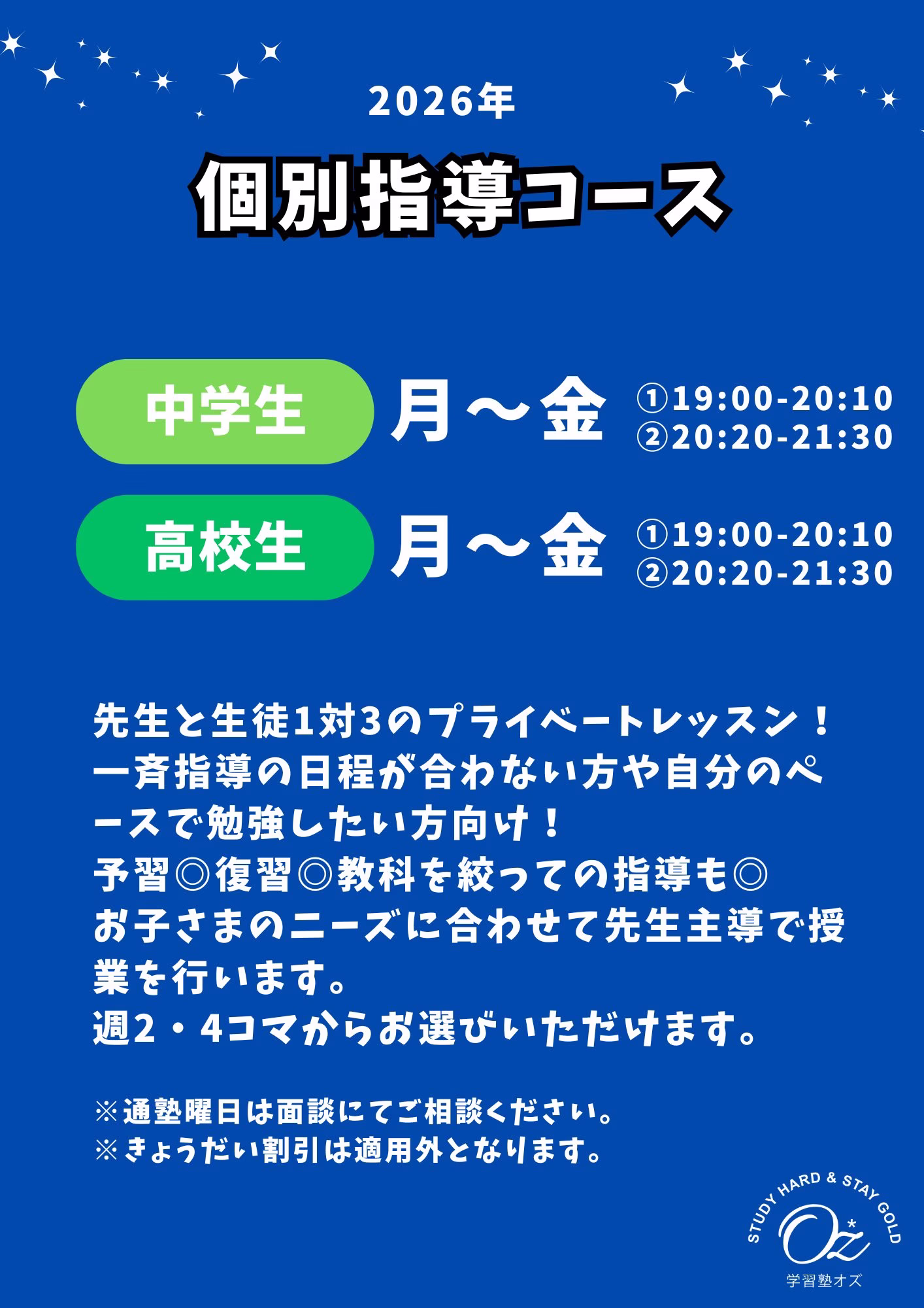 ※このコースでは、英語・数学以外の教科につきましても授業を行いますが、一部科目につきましては、指導可能な曜日に制限がかかる場合がございます。
